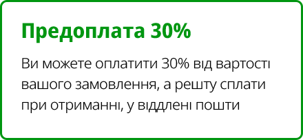 Для часткової оплати замовлення (30%-50% ), реквізити нижче. Другу частину ви зможете оплатити при отриманні товару у відділенні пошти.